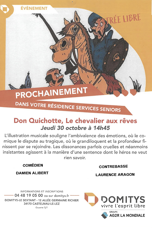 Aujourd’hui, il nous fait entendre sa voix de stentor et de ténor dans le spectacle consacré à Boby Lapointe Entre et assieds-toi en compagnie du pianiste Xavier Ferran, et il nous fait le plaisir d’interpréter les différents personnages du Don Quichotte.