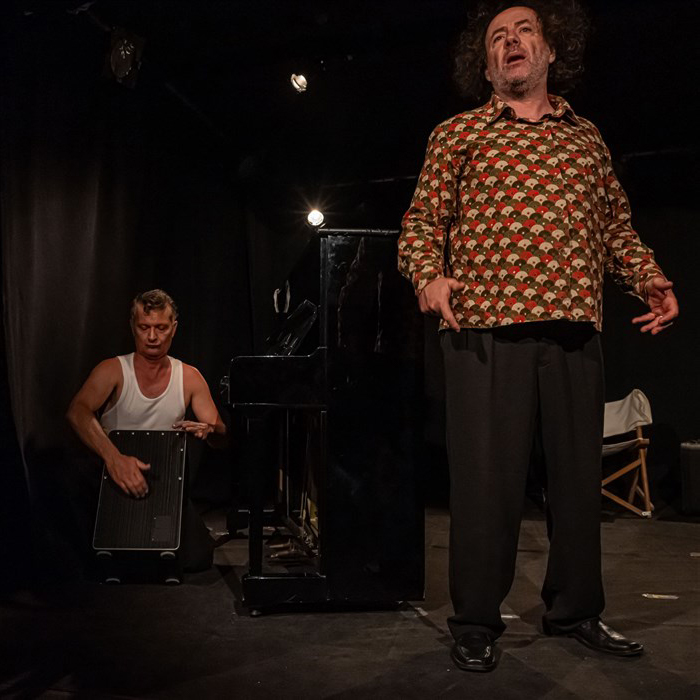 À jardin : Xavier tâchant d’exécuter le récital de piano classique qu’il a préparé. À cour : Damien plein d’affection pour le pianiste lui propose autre chose.